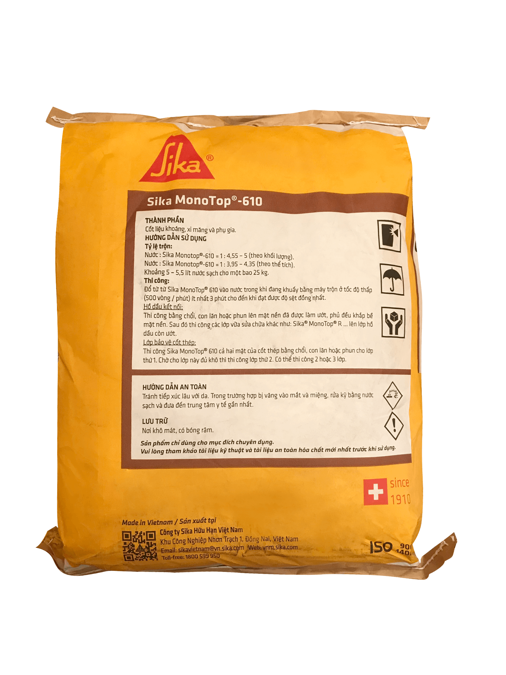 Lưu ý quan trọng: Sika Monotop 610 là sản phẩm gốc xi măng và do đó mang tính kiềm. Cần tiến hành các biện pháp thích hợp để giảm tối thiểu việc tiếp xúc trực tiếp với da. Nếu vật liệu bị văng vào mắt, hãy rửa sạch ngay lập tức bằng nước sạch và đến gặp bác sĩ.